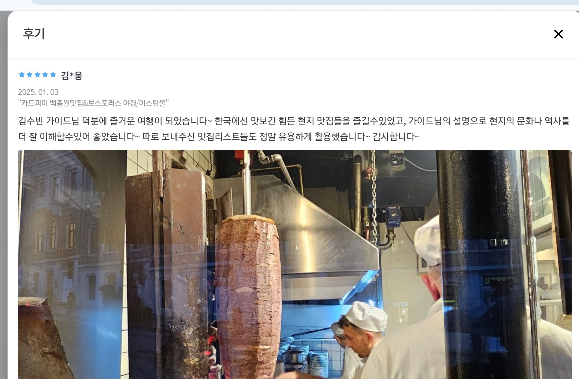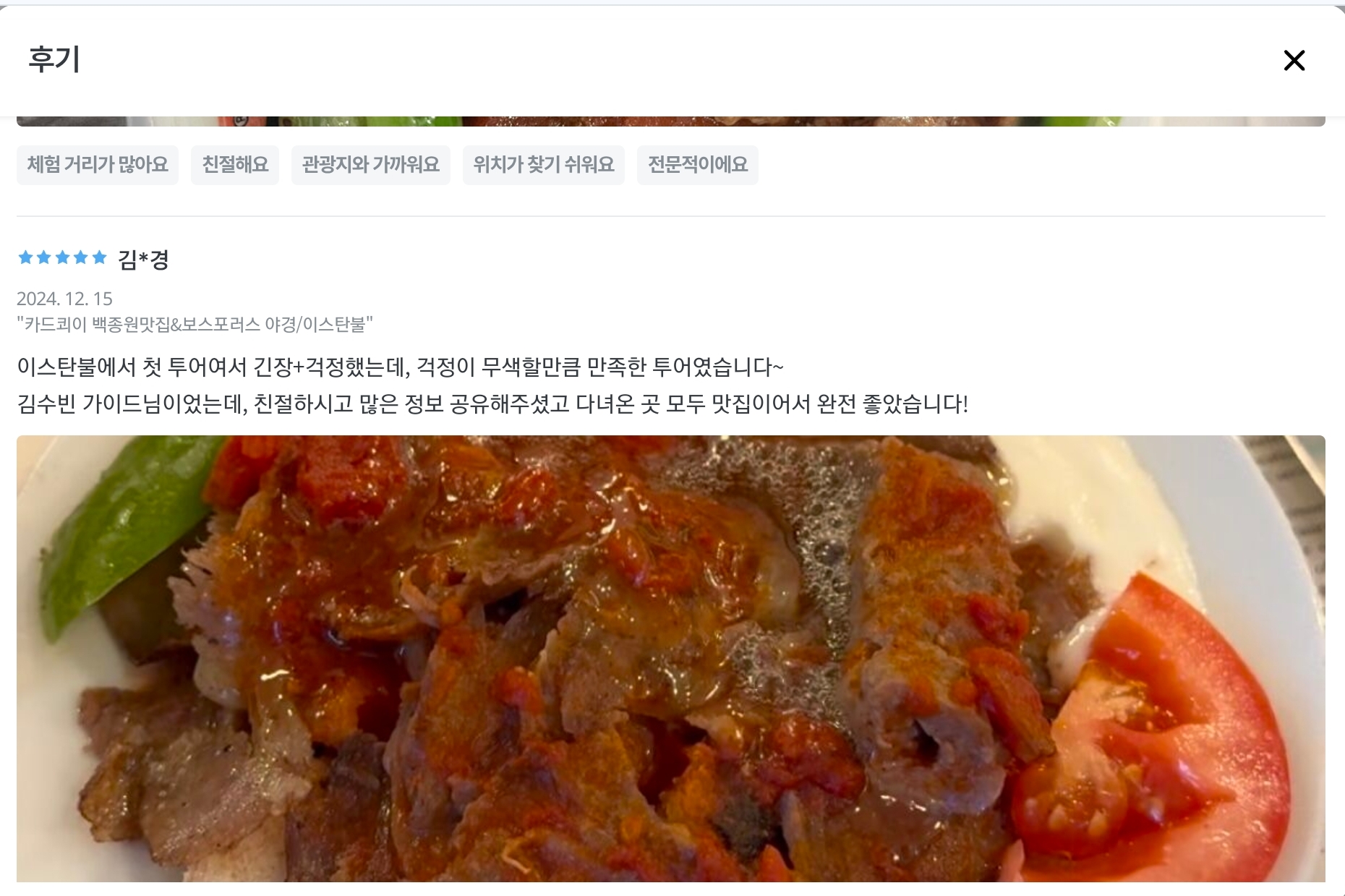 후기를 보면 단순 먹방 투어인줄 알았다가 음식, 도시와 관련된 다양한 역사 문화 이야기를 들을 수 있어서 예상 외로 너무 풍부한 투어였다고 한다. 백종원 영상에서 봤던 그 모습 그대로 터키를 좀 더 알리려는 노력이 반영되어 있는 투어로 보인다. 자세한 후기는 아래 이미지 참고 할 것!