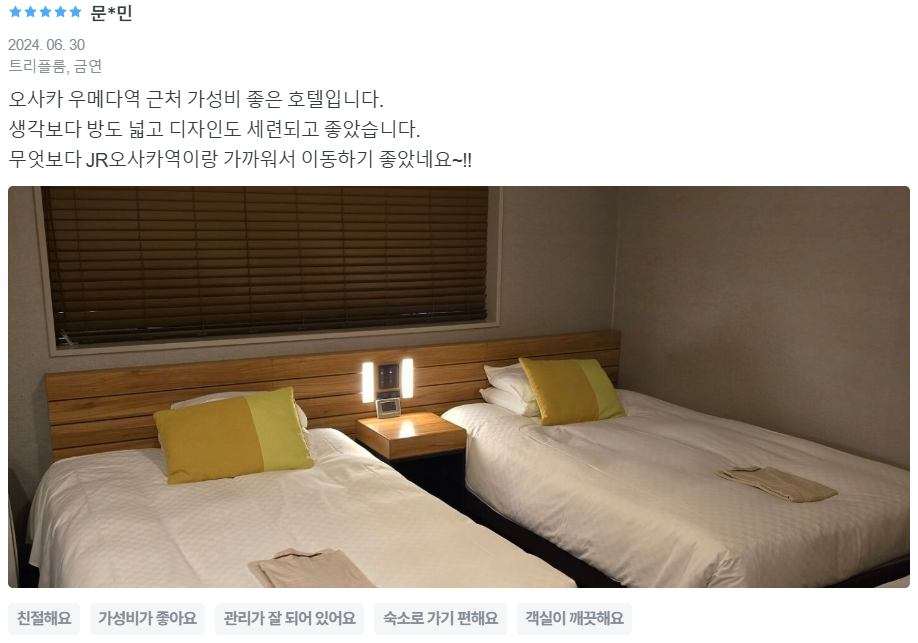 2020년 4월에 개업한 호텔이어서 시설 퀄리티가 좋은 호텔. 후기에서도 볼 수 있지만 JR 오사카역, 니시우메다 역과 가깝고 공항버스 타는 곳도 근처라서, 교통적으로 아주 훌륭한 곳으로 알려졌다.