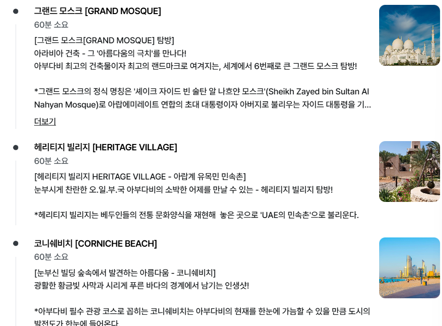 하지만 아부다비는 한국 사람들에게 너무 낯선 곳이기도 하기 때문에 일일투어 프로그램을 많이 사용하는 것 같다. 생각보다 다양한 아부다비 종일 투어 프로그램들이 있어서 놀랐는데, 그 중에서도 요술램프 여행사의 투어가 가장 신뢰할 만 한 것 같았다. (많은 후기 보유)