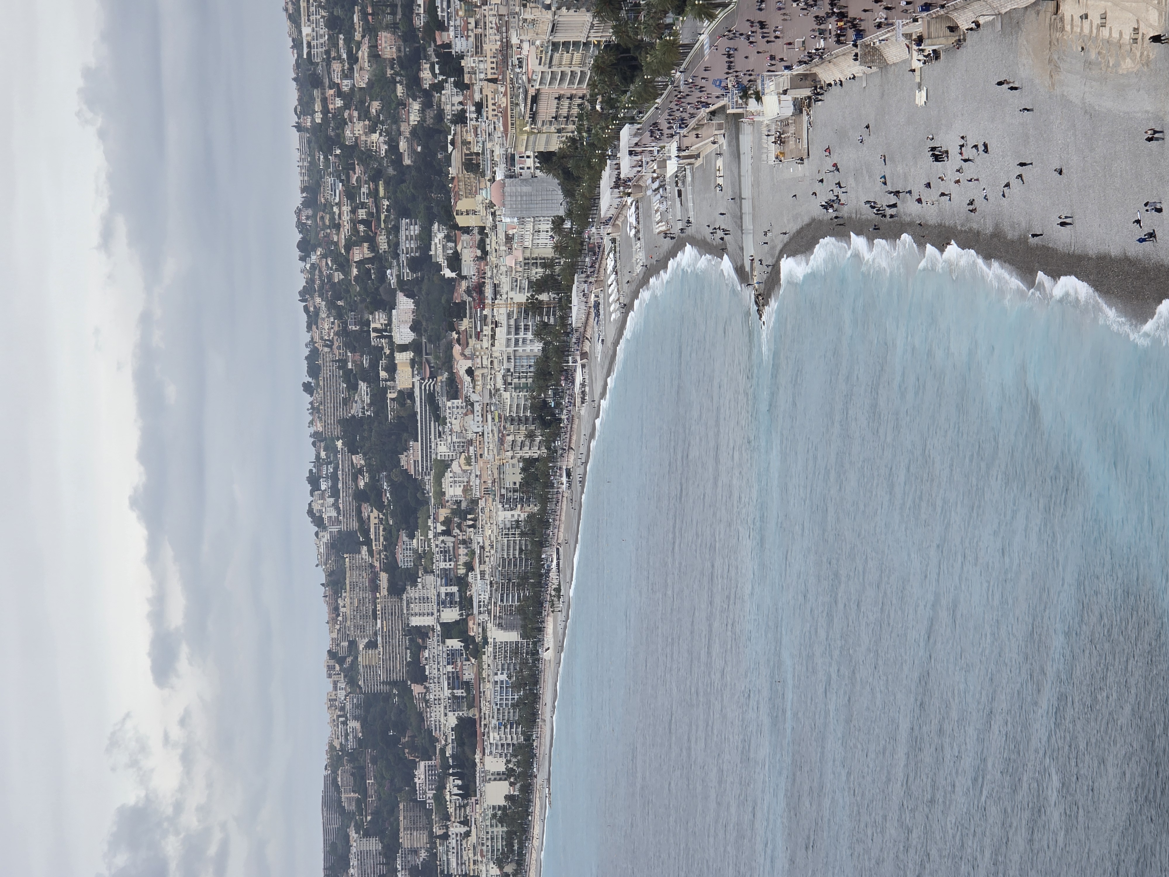 니스는 날씨가 좋지 않아도 아름다운 지중해 바다를 볼 수 있는 곳이다 전망대에 내려다 본 해안가. 해수욕장 근처에 있는 바다의 색깔을 보면 에메랄드 그 자체이다. 4월 맑지 않은 날의 니스에서는 비만 오지 않으면 수영을 하는 것 같았다. 사진으로 보면 날씨가 매우 흐린데 군데군데 수영하는 사람들이 보였다. 위에서 내려다보면 니스라는 도시도 꽤나 크다.
