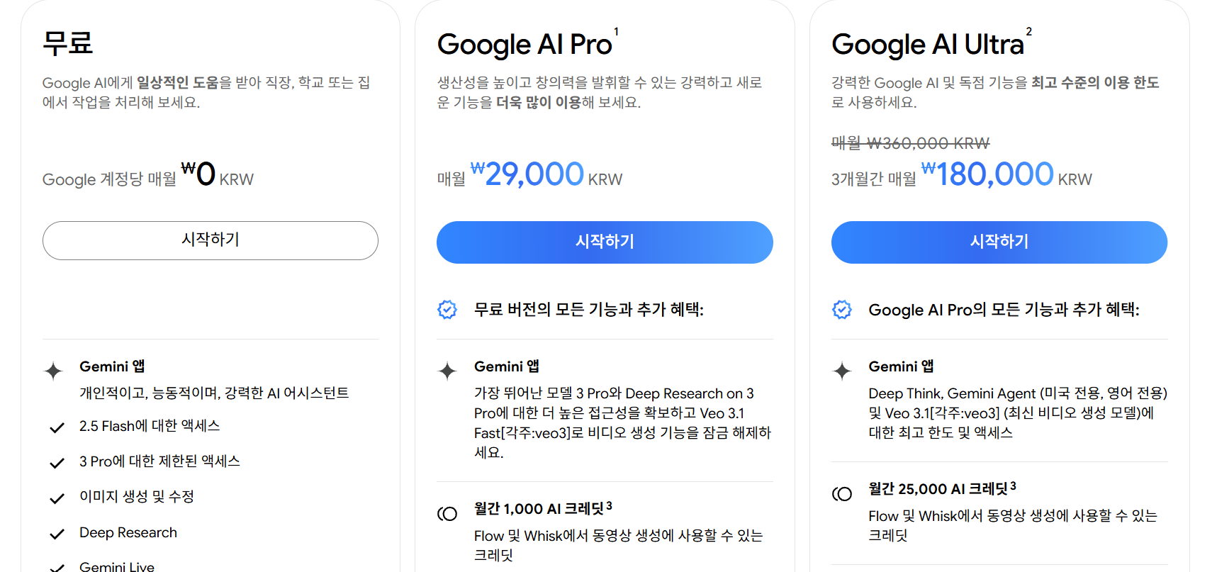제미나이(Gemini)는 무료 버전만으로도 기본적인 AI 기능을 사용할 수 있지만, 사용 빈도가 높아지거나 고급 기능이 필요한 경우에는 Google AI Pro 혹은 Google AI Ultra 요금제로 업그레이드해야 한다.